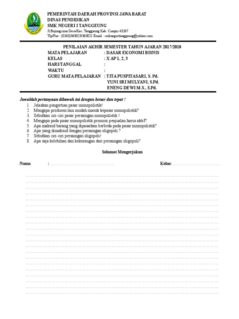 Soal Dan Jawaban Ekonomi Kelas 11 Guru Galeri from imgv2-1-f.scribdassets.com Demikian artikel dari www.ayoksinau.com tentang soal dan jawaban ekonomi sma kelas. Selain soal pilihan ganda, juga dilengkapi dengan soal essay. Contoh soal bahasa indonesia kelas 10 semester 1 dan 2 beserta jawabannya kurikulum 2013. Makalah materi soal penjas kelas 10 sma/ma diterangkan mulai dari sd, smp, atau sma, mts, ma dan smk lengkap dengan jawabannya serta pembahasannya. Apa saja kebutuhan menurut sifatnya 12. Soal ekonomi kelas x dan kunci jawaban ulangan umum semester ganjil _ materi ekonomi. Rani got married… 2004 jawaban: Berikut soal ekonomi kelas 10 semester ganjil kurikulum 2013 k13 dan kunci jawabannya untuk siswa smama.